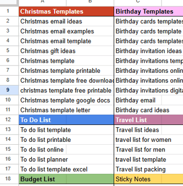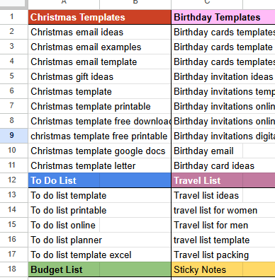 In the image above I typed in Necklace on Bing, the sentences below it are the most popular search terms for that word. Use the words in your industry to find out what sentences people in your industry are using, then write them down into a document. I prefer to use Google Sheets for SEO, as shown in the image below, which I used to find SEO for Printable Templates.